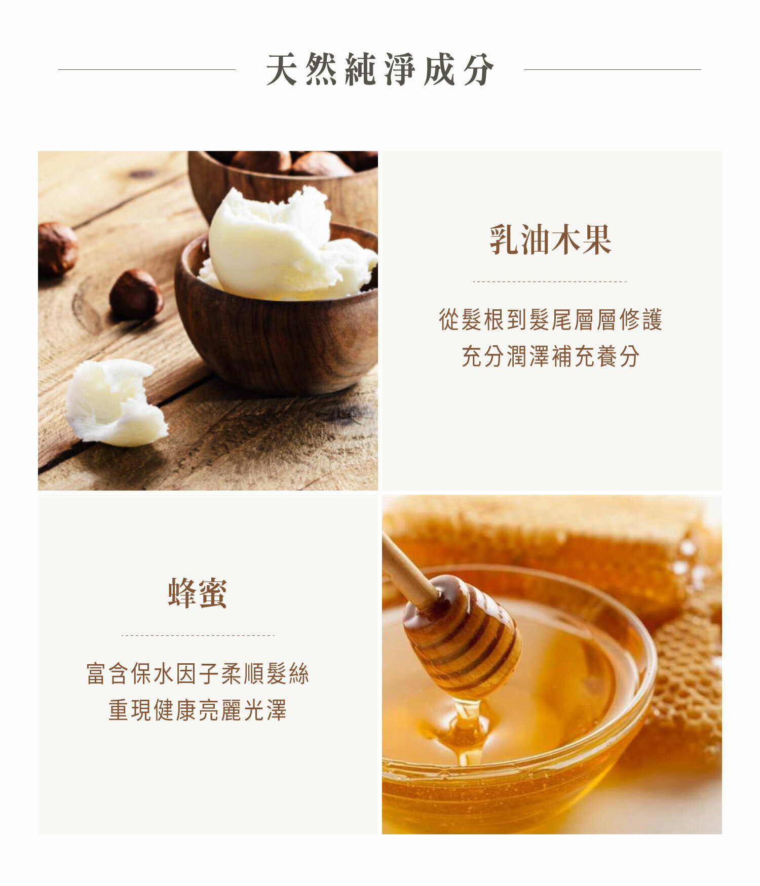 • 乳油木果、蜂蜜補充養分,重現亮麗光澤