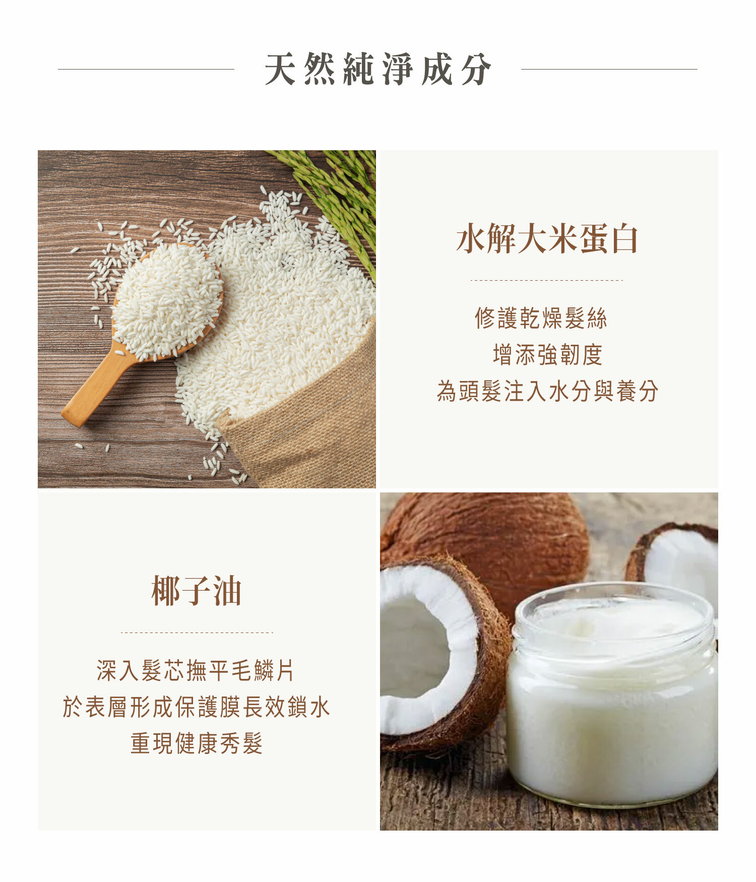 • 水解大米蛋白、椰子油深層補水,增添強韌度